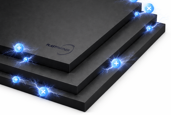 PE-UHMW 1000 v antistatické úpravě spojuje vynikající kluzné a otěruvzdorné vlastnosti PE materiálu a zároveň díky přidaným vodivým částicům zabraňuje tvorbě statického náboje. Chemická odolnost je samozřejemostí a nulová nasákavost vlhkosti.